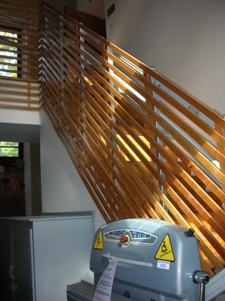 Les combles existants ont ainsi été intégrés au volume de la nouvelle salle et de nouvelles circulations verticales, intégrant notamment une plateforme pour personnes moins-valides, ont été installées.