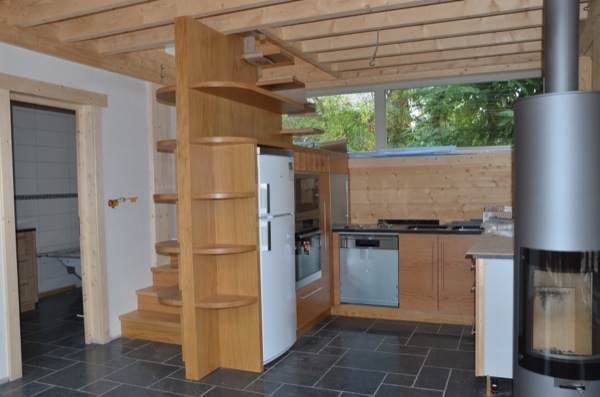 Parallèlement, des astuces ont dû être trouvées afin d’optimiser au maximum l’espace disponible, notamment la création d’un « escalier-cuisine » où le mobilier haut est encastré sous les marches.