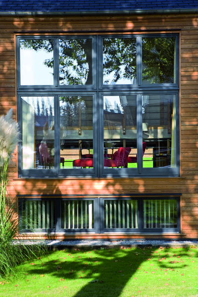 Construite entièrement en bois grâce au procédé de poteaux et poutres, les façades de la maison sont totalement réalisées en bardage en bois, dont l’essence est le mélèze. Les menuiseries extérieures sont également en bois et la toiture est réalisée en ardoises.