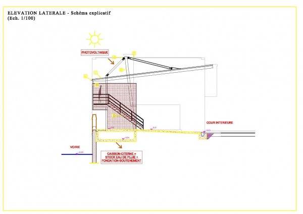 - Fermé du côté rue par un caillebotis métallique, la toiture permet le placement de panneaux photovoltaïques, permettant de diminuer la consommation électrique du service administratif.