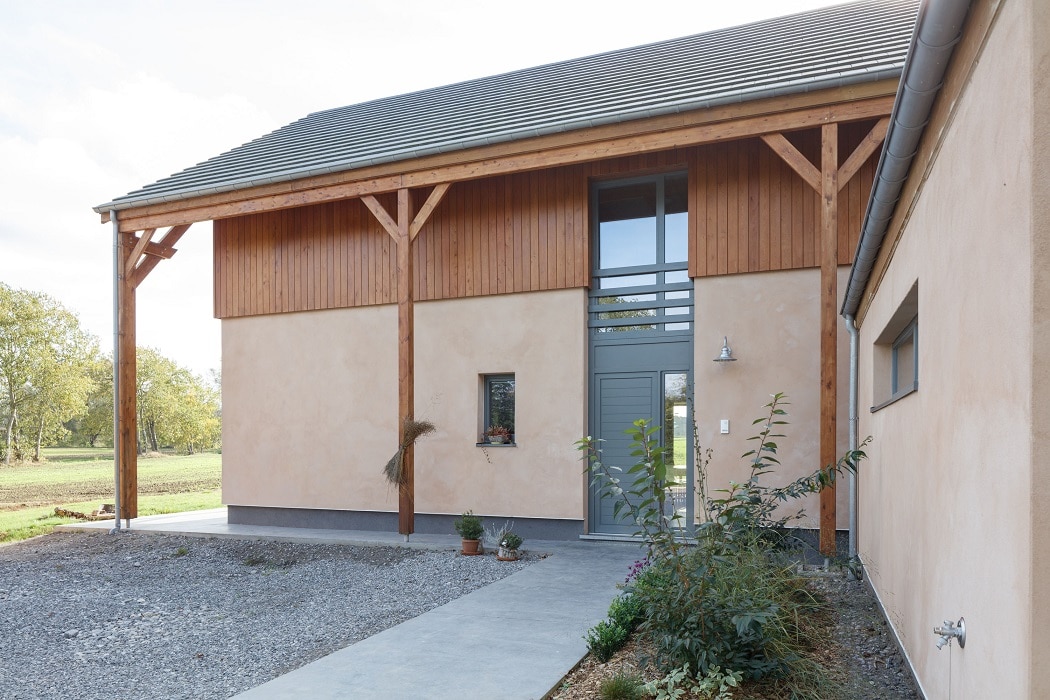 L’architecture de la maison s’est largement inspirée des bâtiments agricoles en bois, d’une part pour s’intégrer au mieux dans le milieu rural environnant, d’autre part afin d’établir une corrélation entre le bâti et les matériaux naturels choisis.