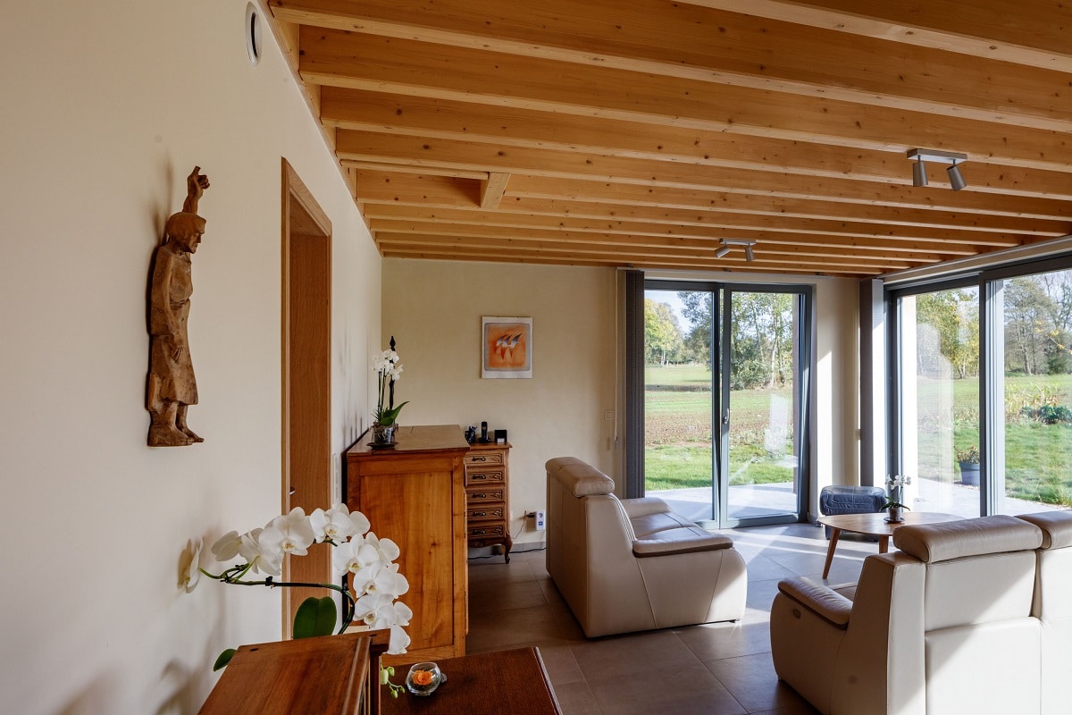 Selon les vœux des Maîtres d’Ouvrage, des matériaux naturels bio-sourcés, issus des filières agricoles et sylvicoles ont été utilisés au maximum : du bois en CLT cloué pour la maison, des blocs en chaux-chanvre pour l’isolation intérieure et extérieure,… En respectant un circuit très court car la production de ces matériaux bois et chanvre est fabriquée à moins de 50 km du chantier.