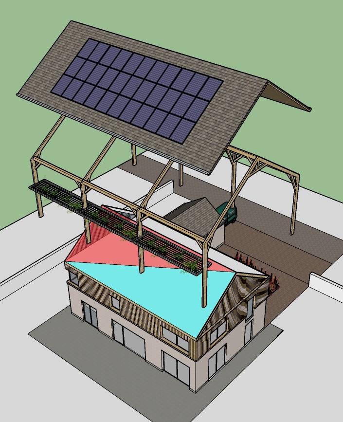Partant d’une architecture rectangulaire, une « boîte » en CLT abrite les 2 niveaux de l’habitation. Une « halle » en poteaux-poutres de bois lamellé-collé couvre l’ensemble. Indépendante du volume habitable, elle crée au-dessus de ce dernier un « grenier thermique », légèrement ventilé, qui réduit les pertes calorifiques en hiver et tempère efficacement la surchauffe en été. Cette halle participe également à la protection solaire en été et protège les façades. Elle permettra également la fixation de brise-soleil, en évitant les ponts thermiques.